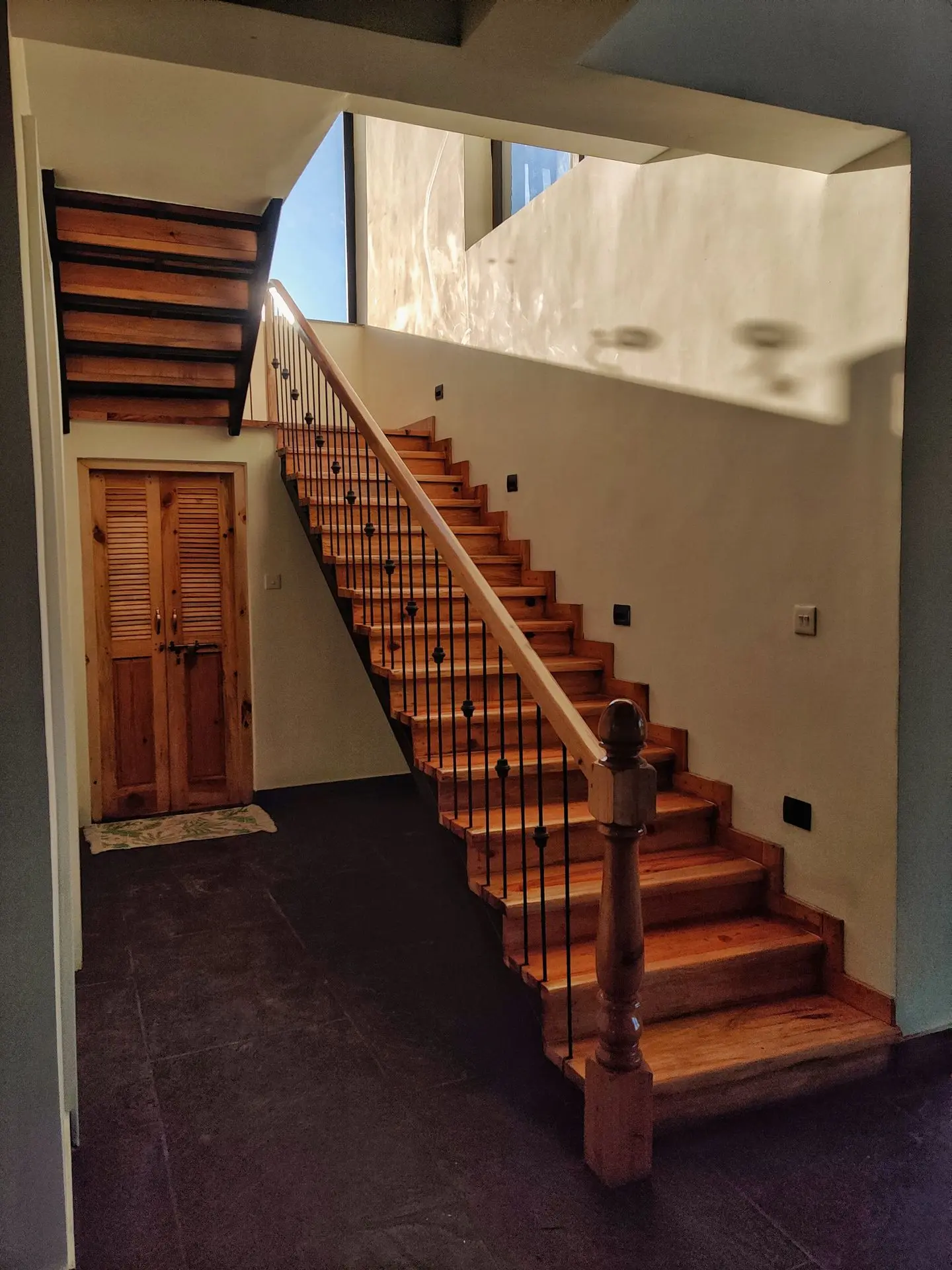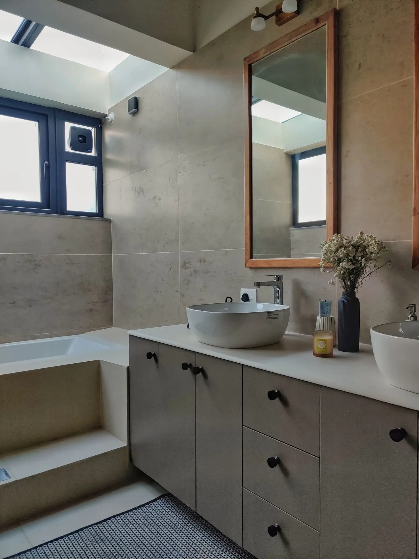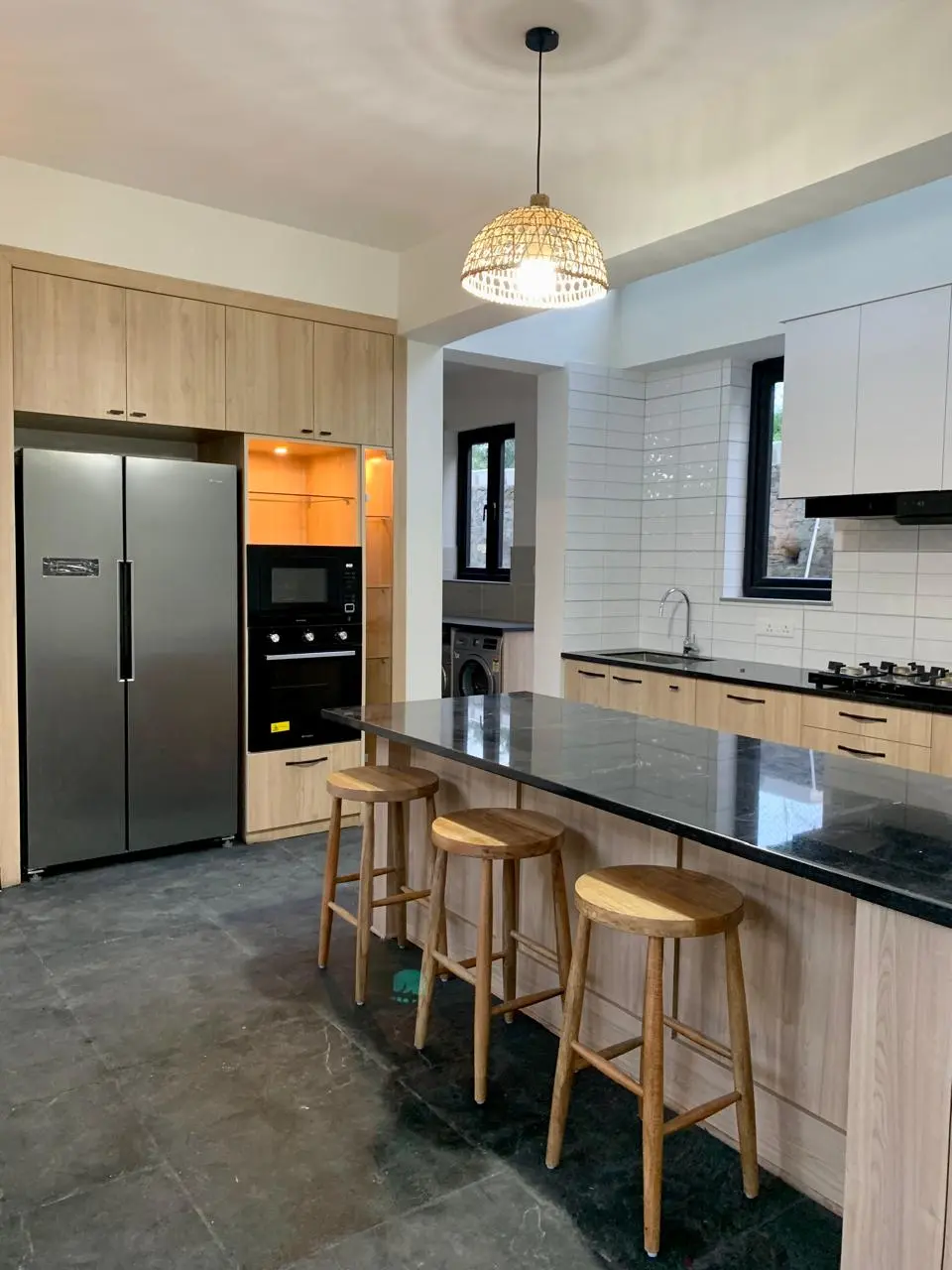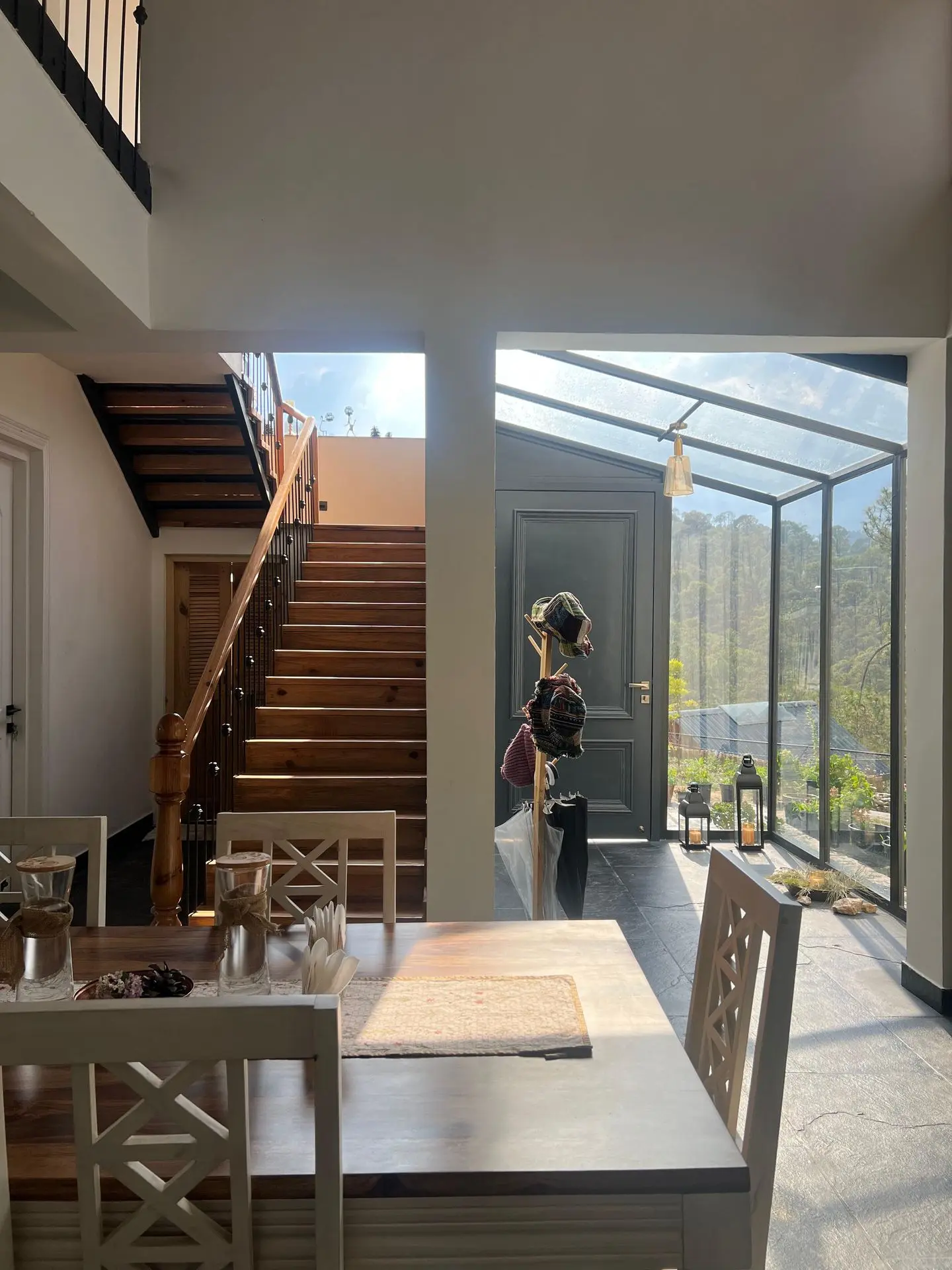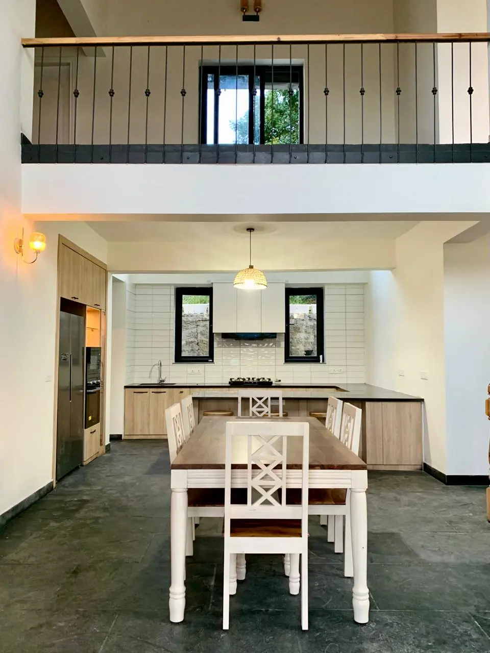 The dining area forms the heart of the house as a double height space connecting both floors. Placed next to the open kitchen, it encourages social interaction and togetherness. Large windows and French doors open toward the garden, filling the space with natural light and connecting it seamlessly to the outdoors.