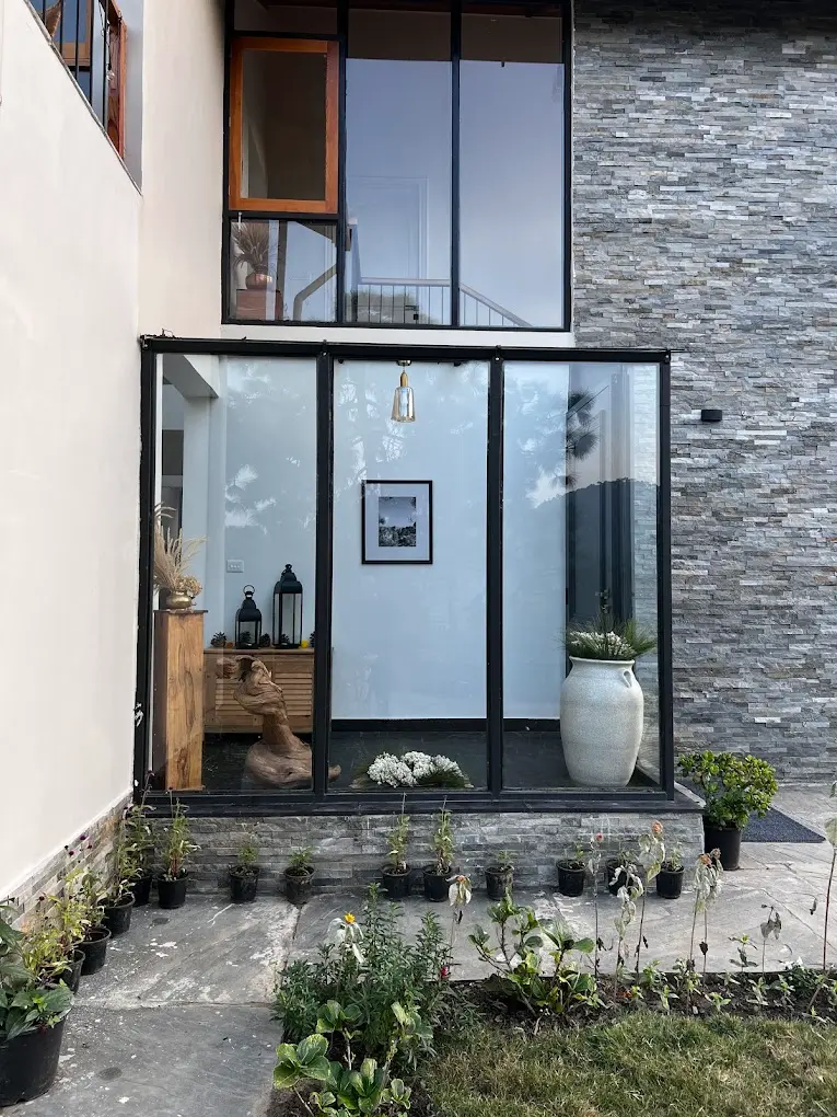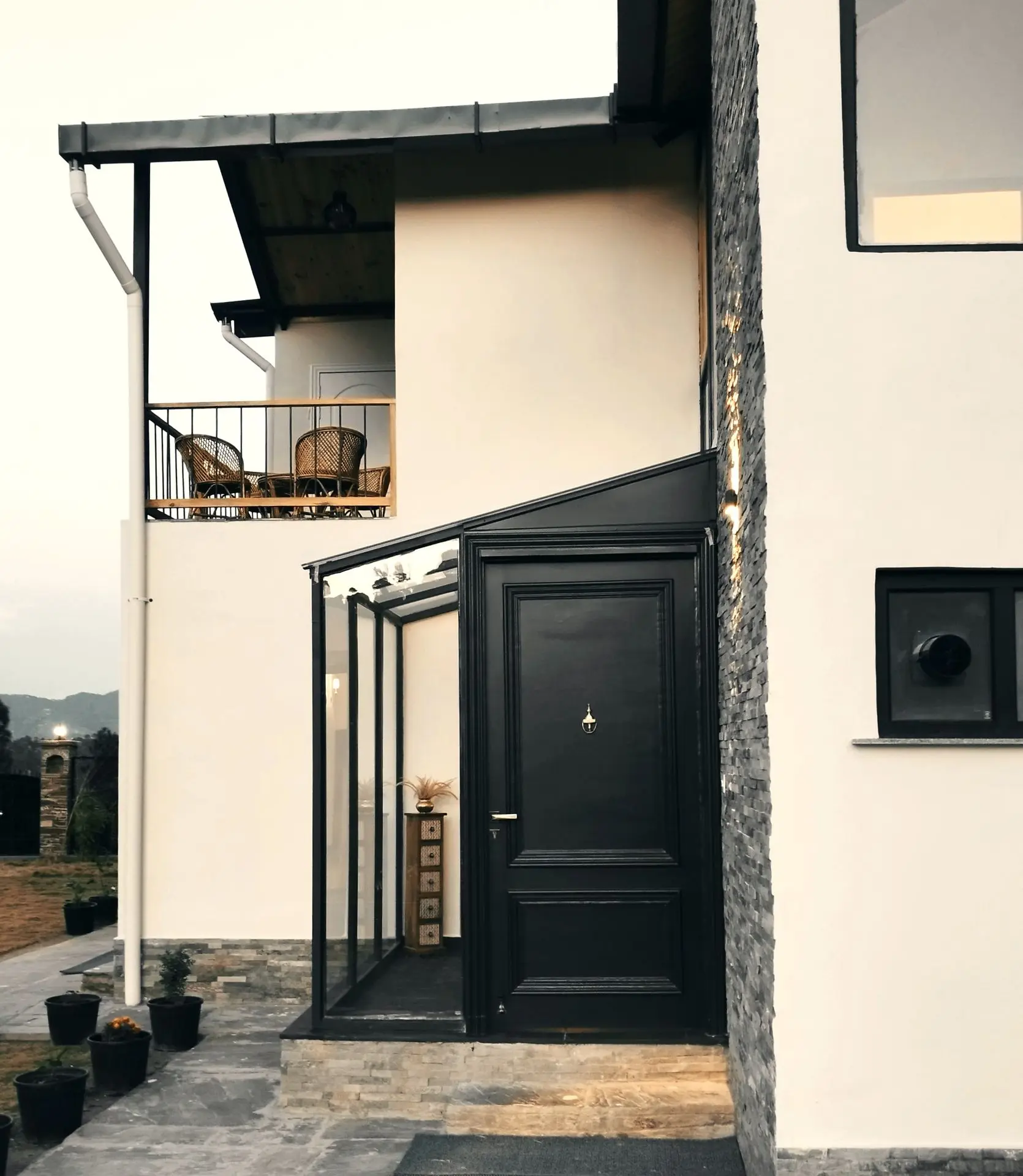 The entrance creates a bold yet welcoming first impression with a black door framed by a glass enclosure. This foyer acts as a gentle transition between the outdoors and the interiors, establishing openness while introducing the home’s modern architectural language.