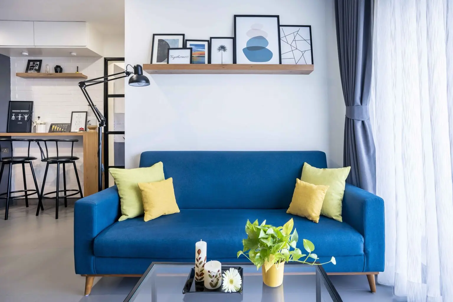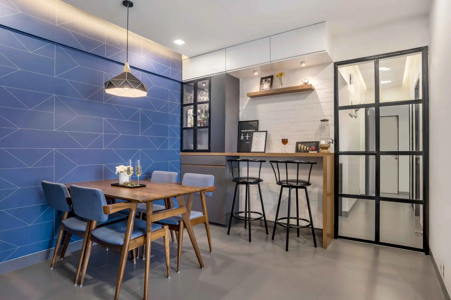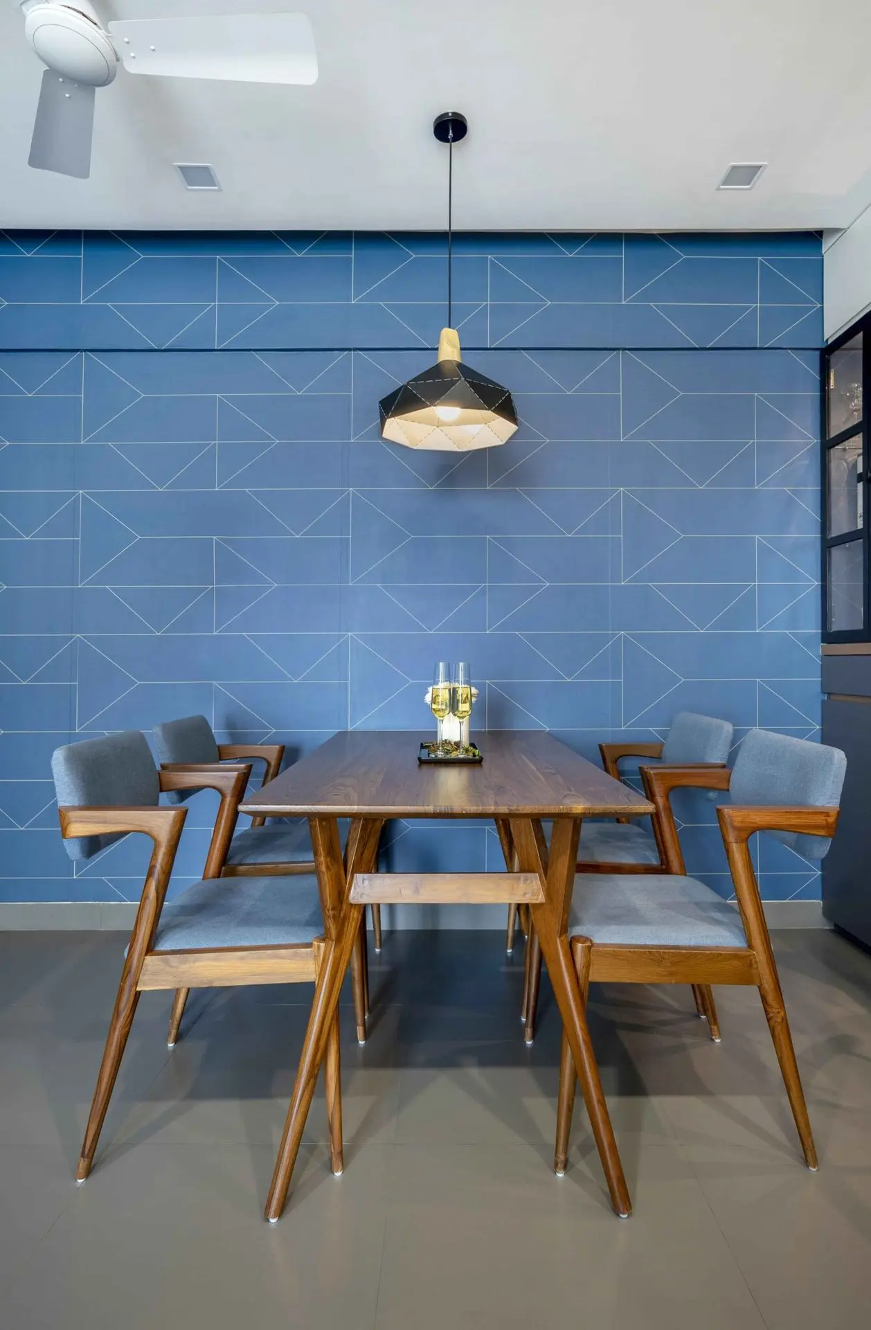 Pops of colors have been added with mustard yellow and sea green in the soft furnishings while teal blue is the highlight color which appears in the wallpaper and the 3 seater sofa with the pouffe in the living cum dining space.