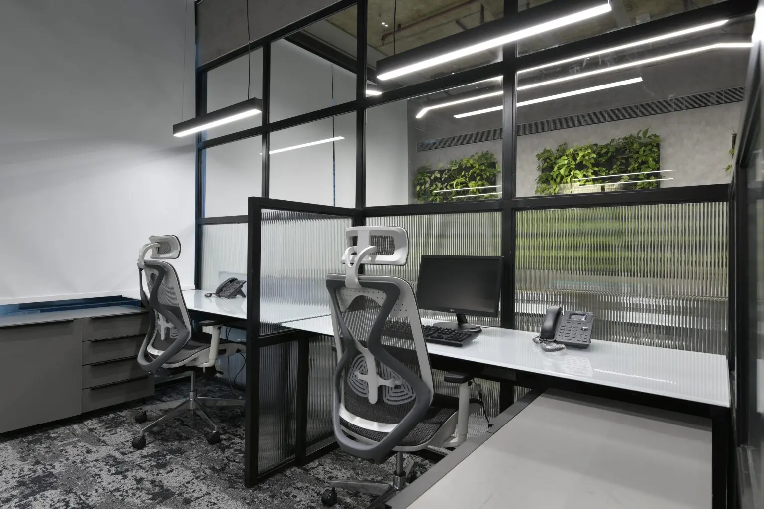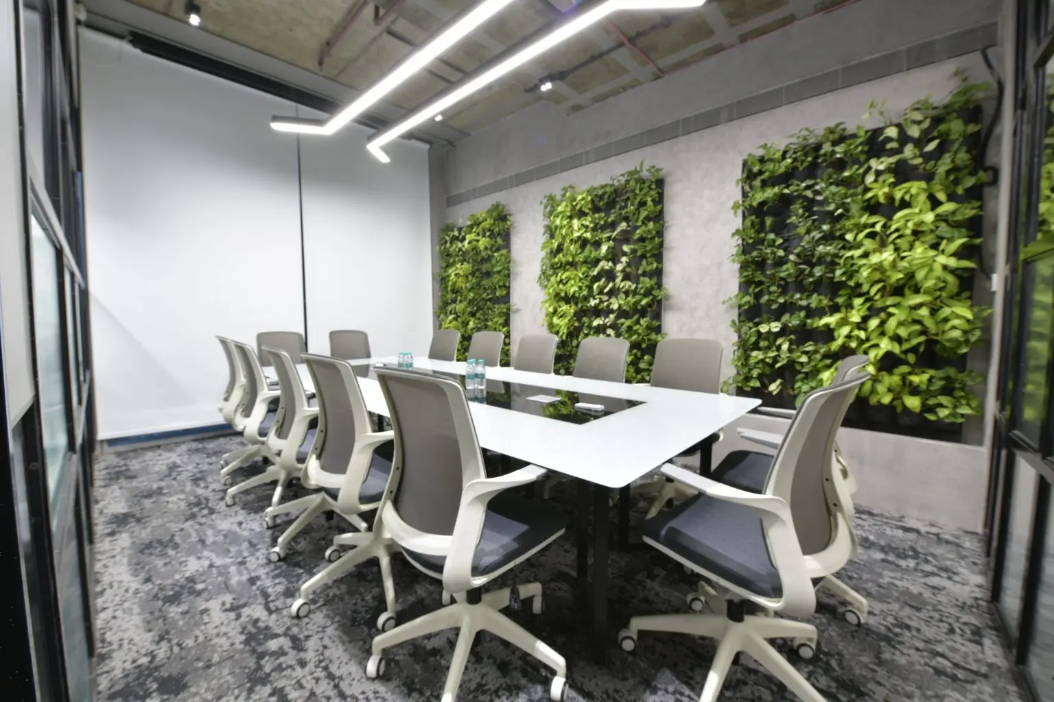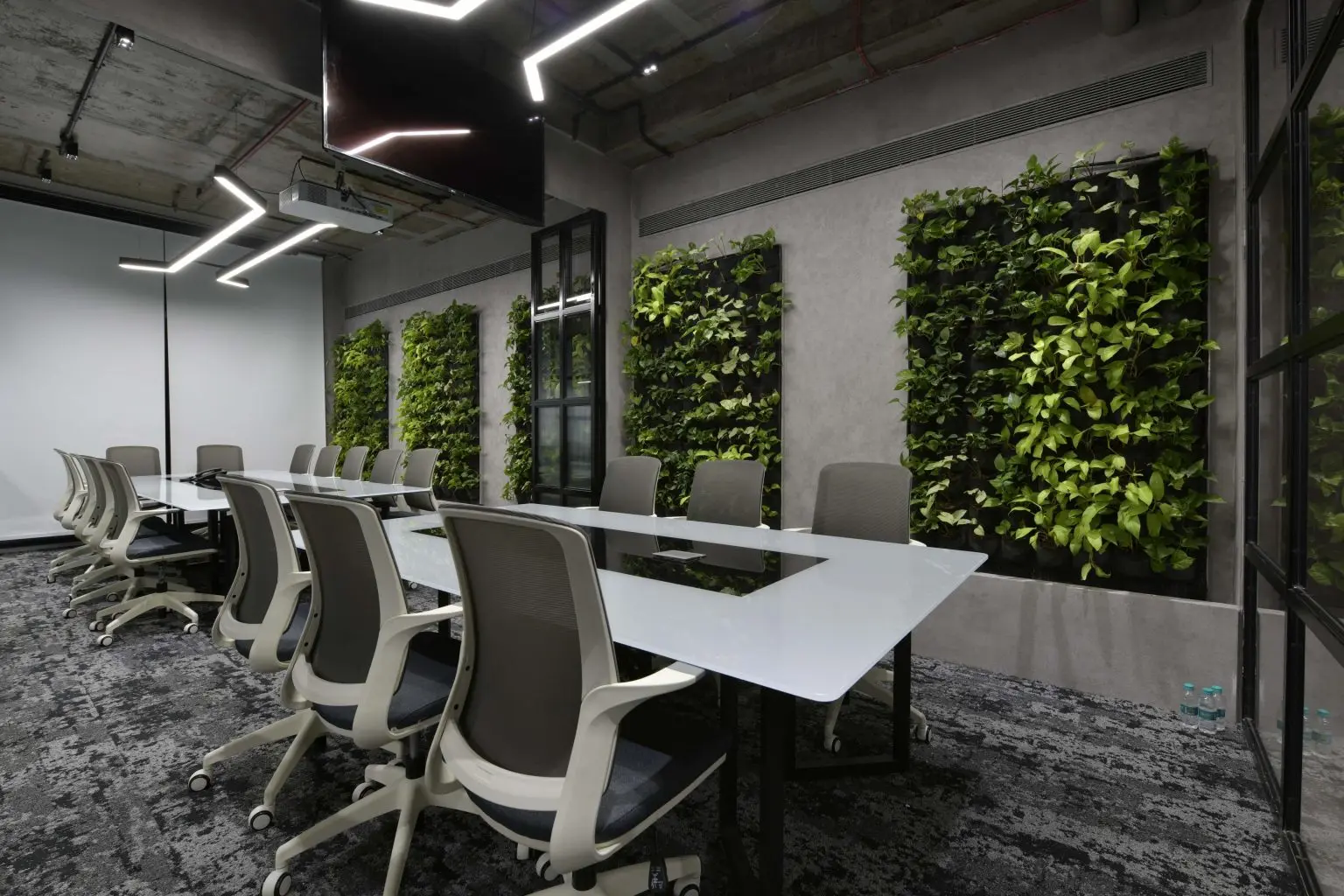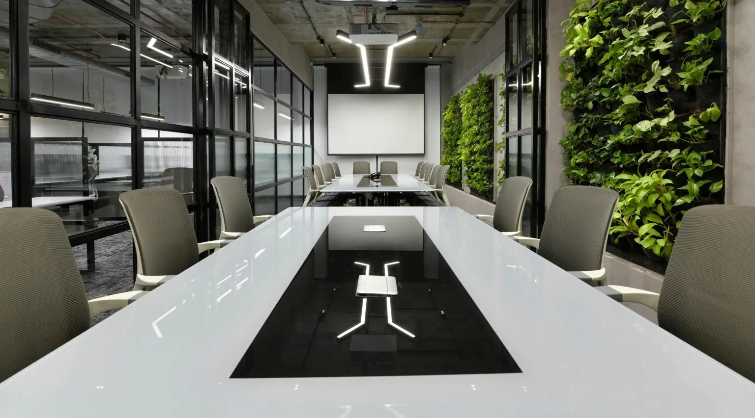 Lounge areas are casual zones with vertical gardens and custom lighting that create a lively atmosphere. These spaces offer employees a place to relax, interact, and stay connected beyond their desks.