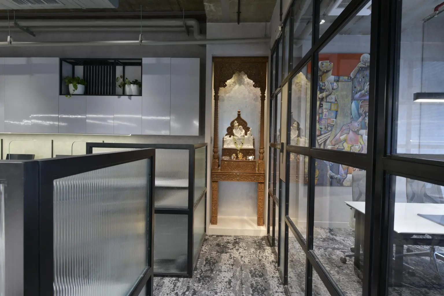 Directors’ cabins are placed along the periphery to make the most of scenic outdoor views while overlooking the main work area. Glass partitions keep these spaces interactive yet private, maintaining a visual link with the team.
