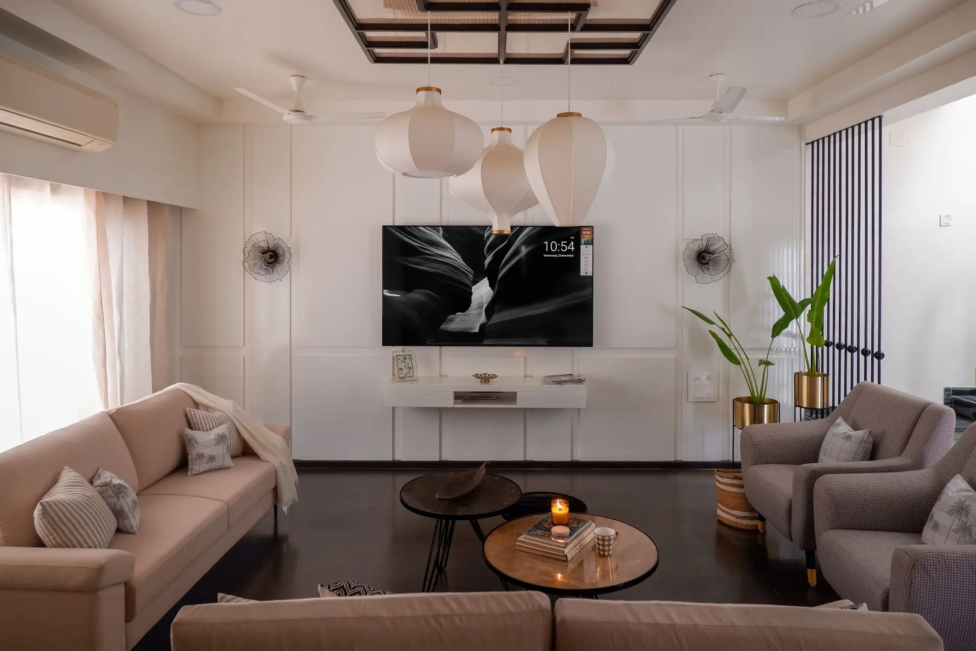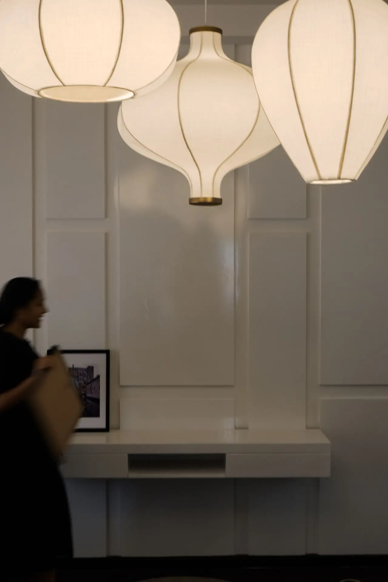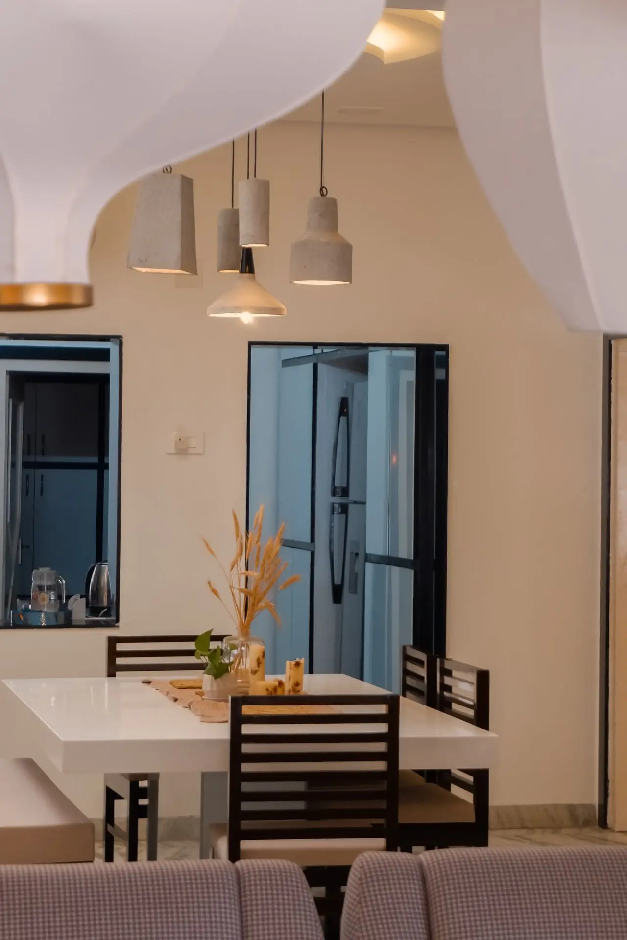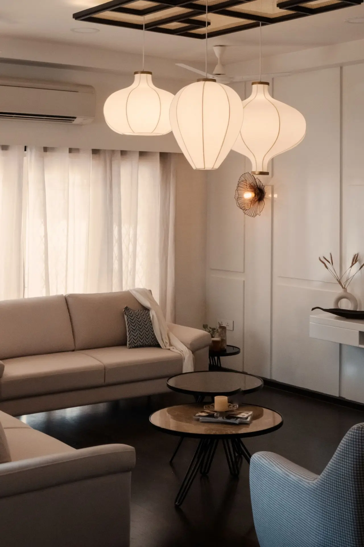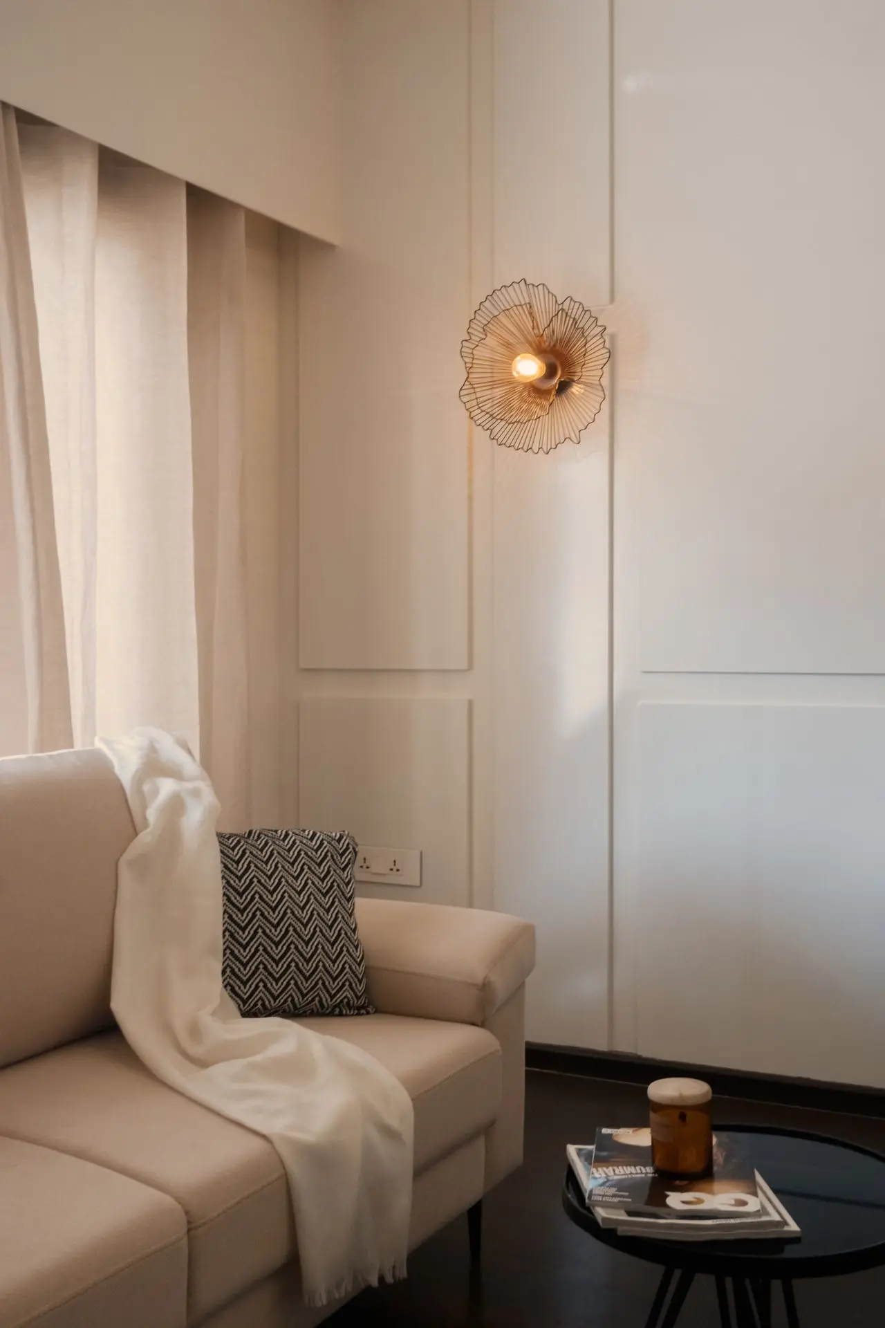 To soften the minimal architecture, organic curves were introduced through lighting and furniture. Lantern-inspired pendants, sculptural metal sconces, and rounded accessories create a gentle contrast against the clean lines of the shell. This interplay of straight and curved forms adds character without disturbing the serenity of the space.