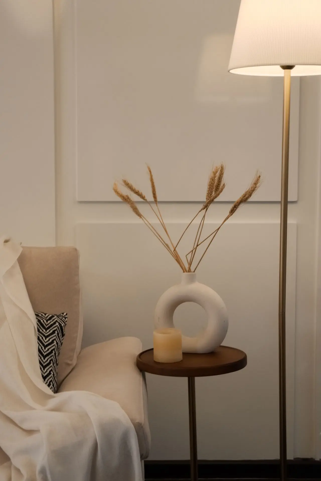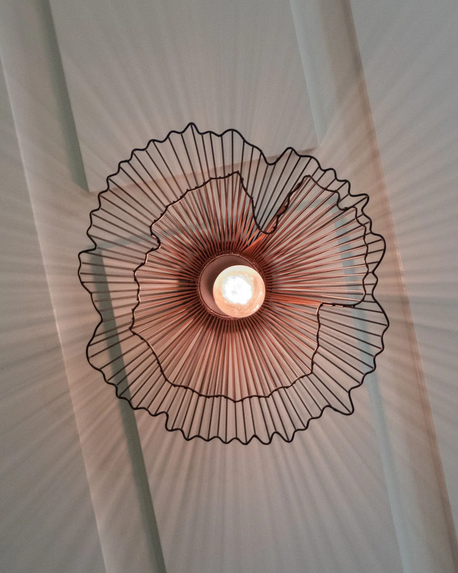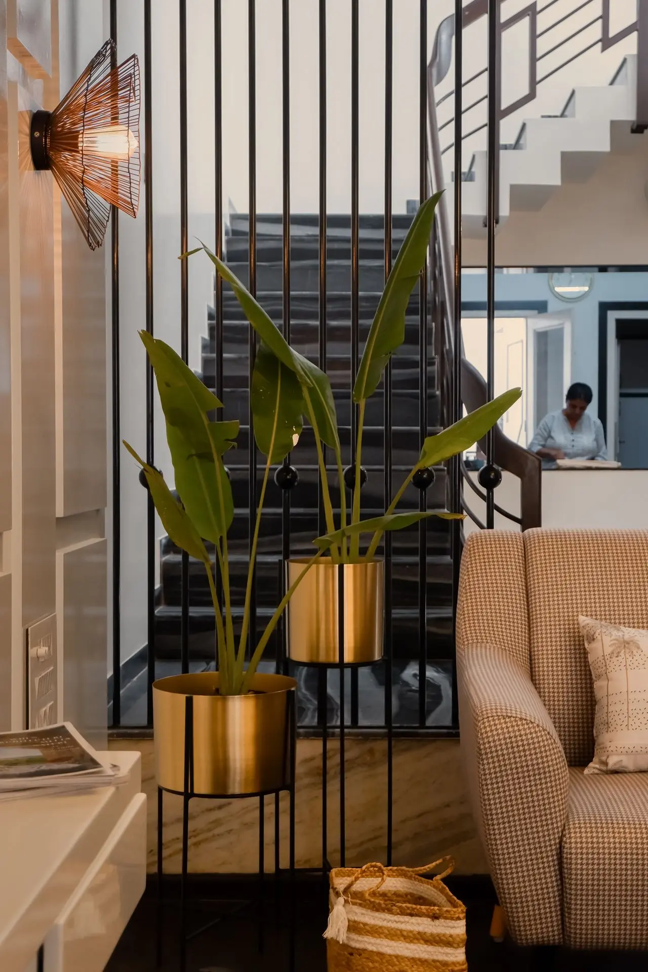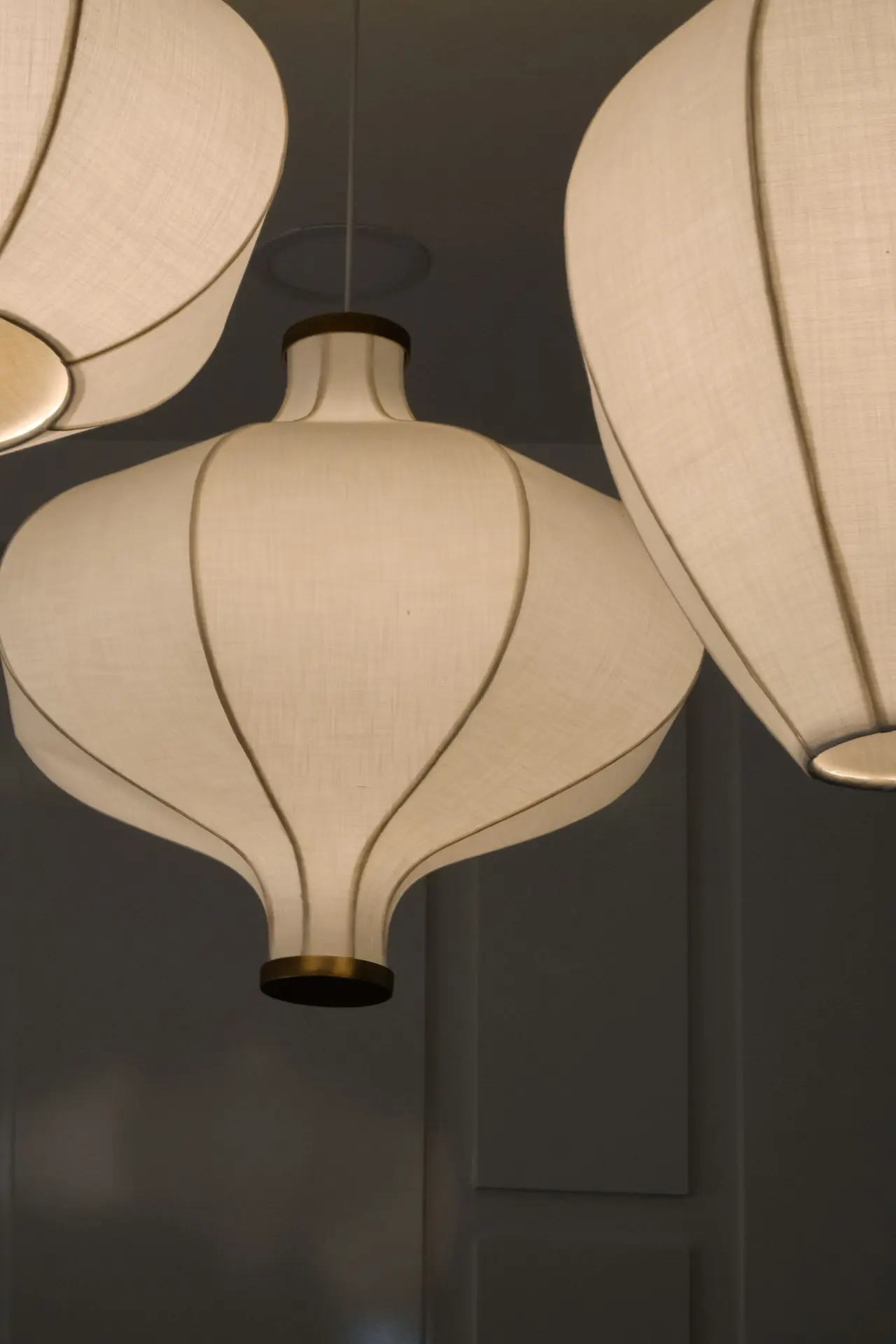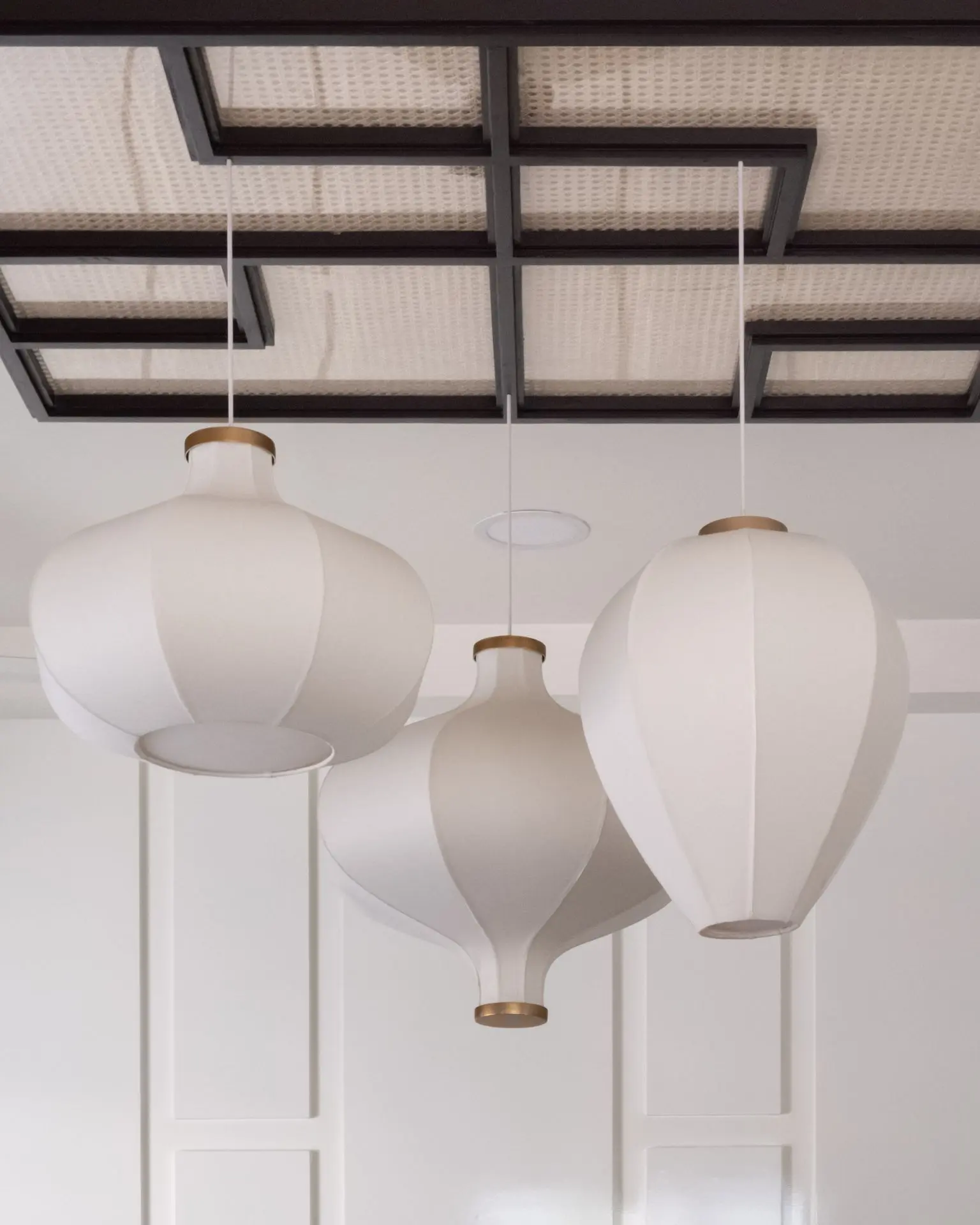 To soften the minimal architecture, organic curves were introduced through lighting and furniture. Lantern-inspired pendants, sculptural metal sconces, and rounded accessories create a gentle contrast against the clean lines of the shell. This interplay of straight and curved forms adds character without disturbing the serenity of the space.