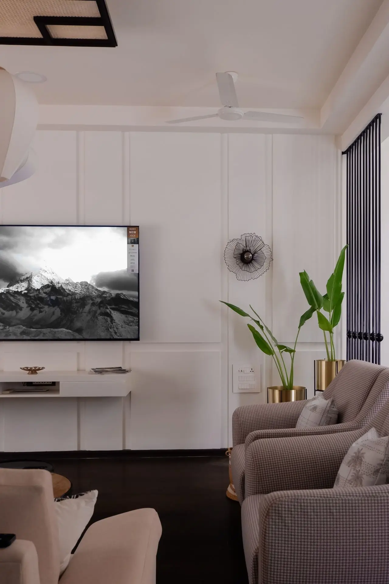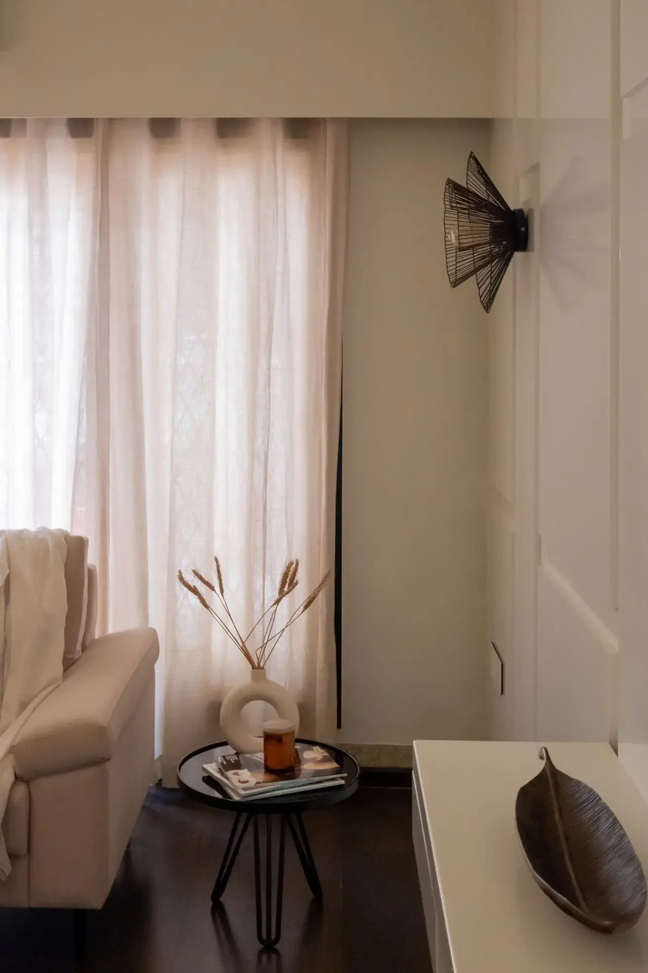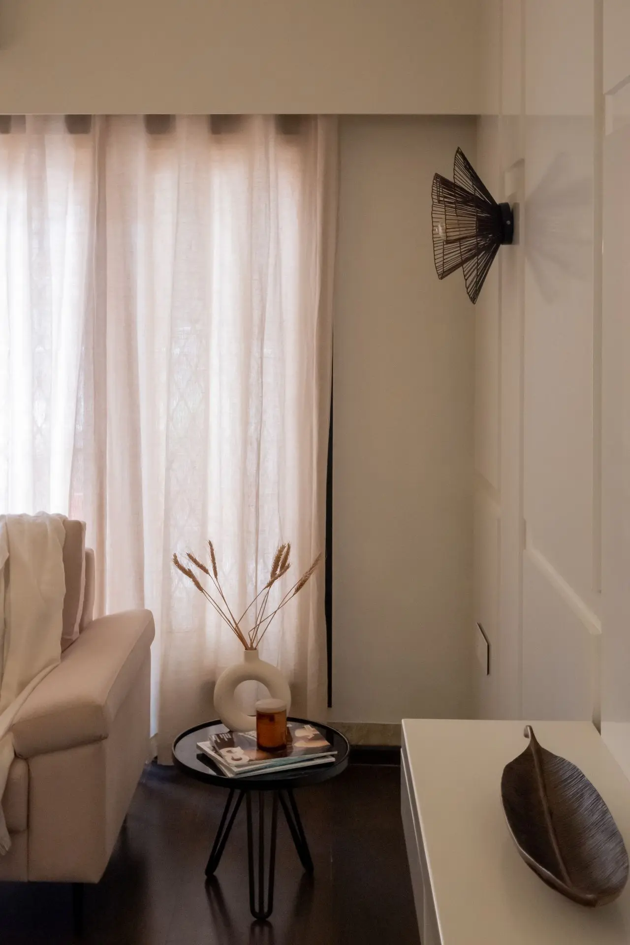 Material choices remain intentionally understated. Custom pendant lamps, rice-paper-inspired diffusers, white panelled mouldings, ceramics, books, and greenery come together to maintain a warm, uncluttered ambience. The project’s quiet USP lies in how small, thoughtful interventions have transformed the space into a warm, welcoming haven that feels timeless and personal.