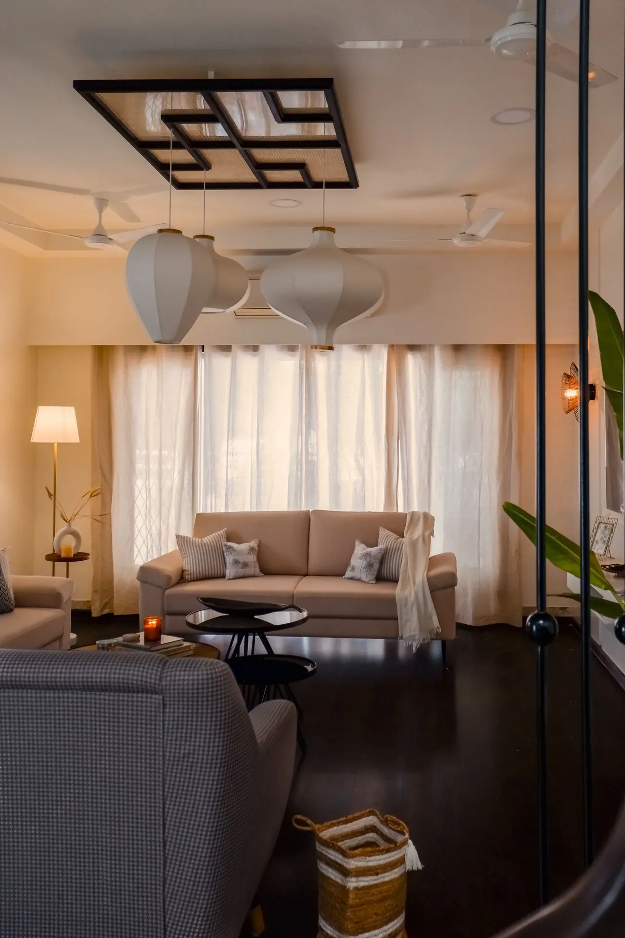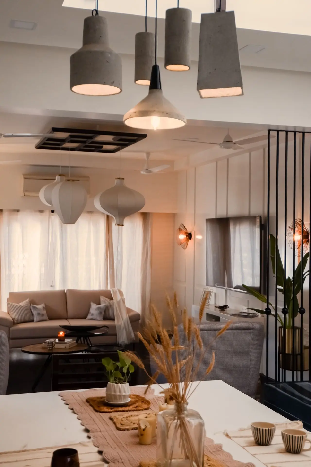 Lighting plays a defining emotional role. Natural daylight is layered with warm, atmospheric lighting that shifts the mood throughout the day. Metal art–inspired fixtures and Asian lantern-like elements introduce subtle global craft influences, giving the home depth without overwhelming its simplicity.