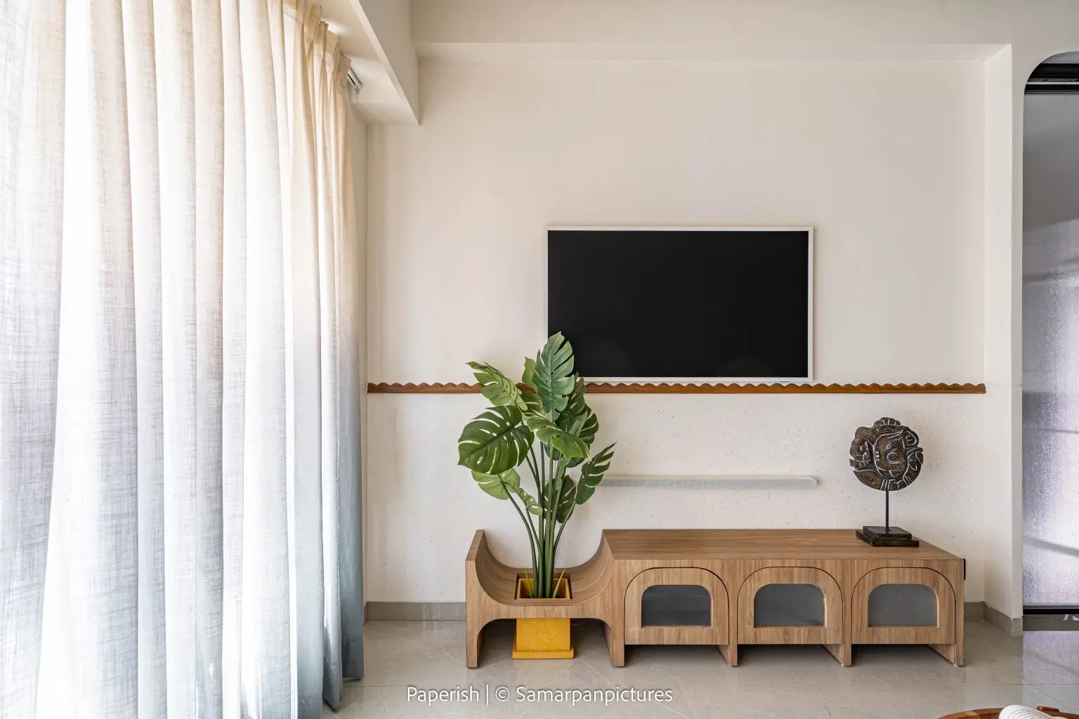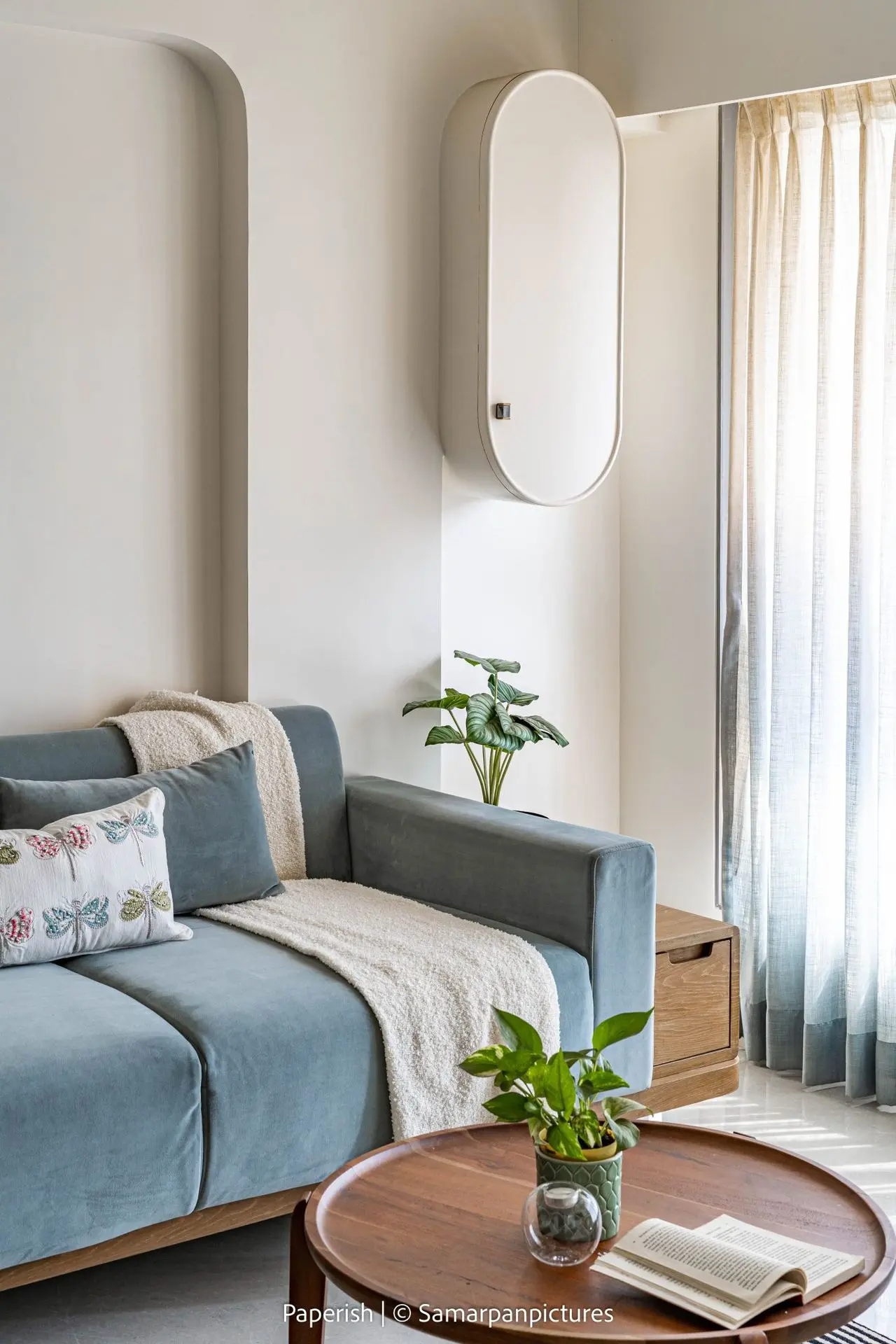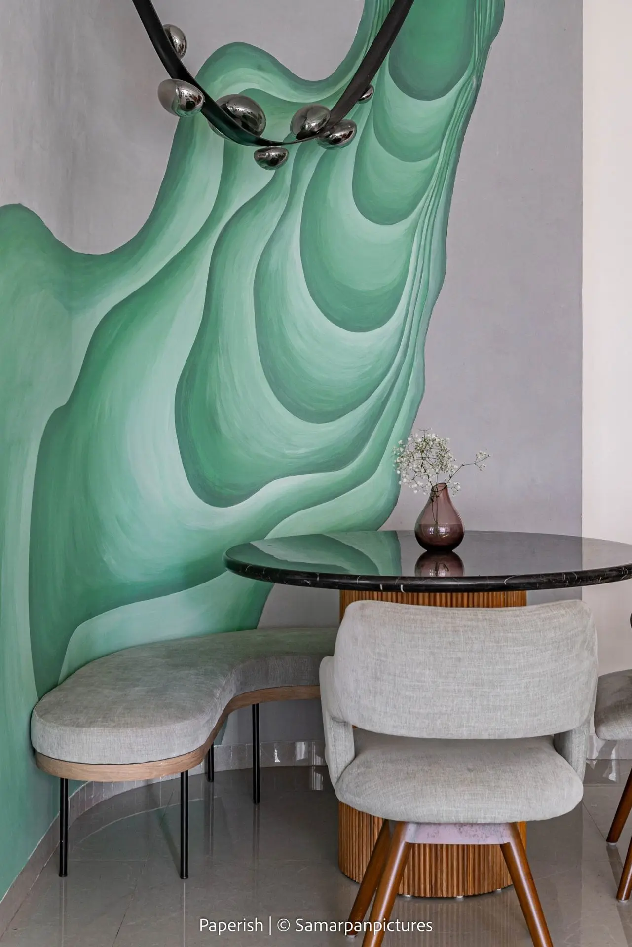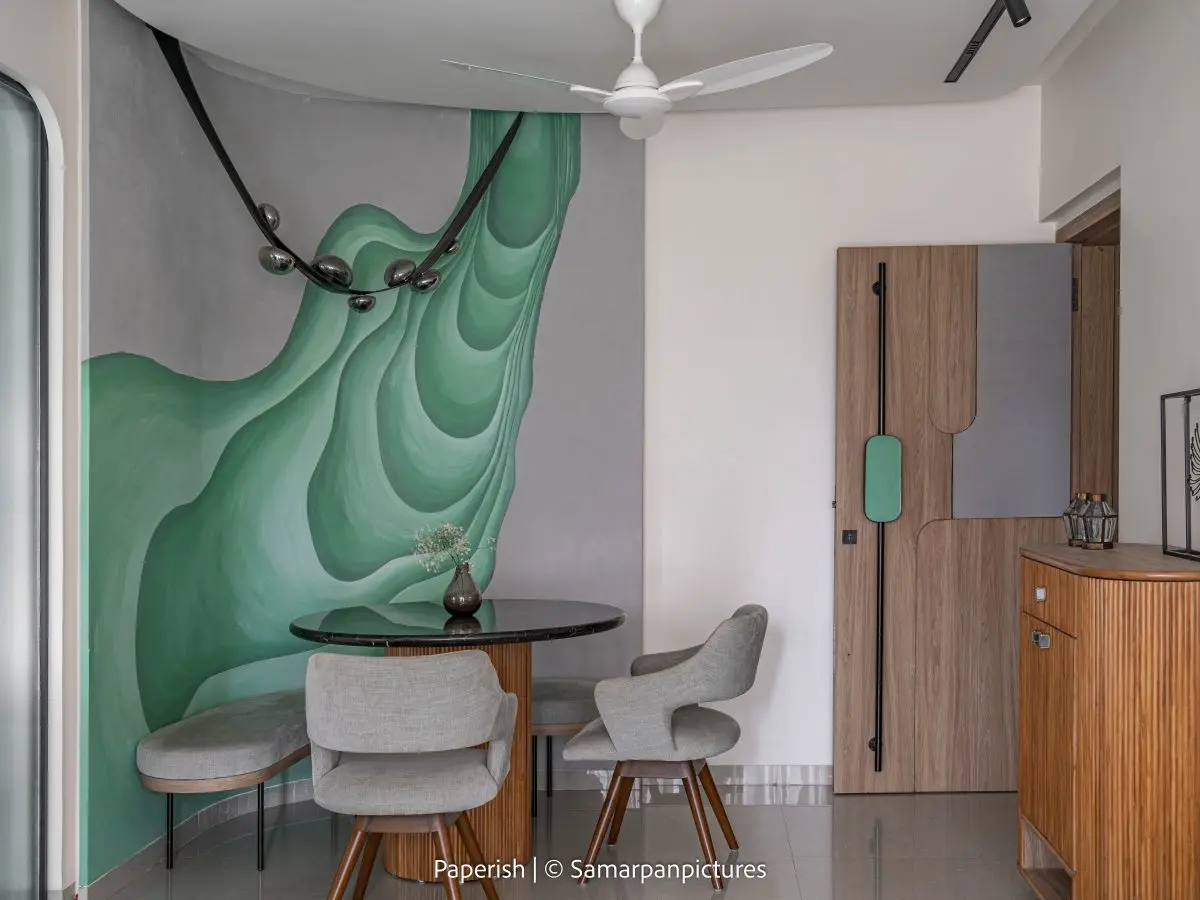 The living room features mild terrazzo textures on the walls paired with warm wooden accents, creating a raw yet refined atmosphere. A striking highlight is the curved artistic wall and the hanging light cascading from the curved ceiling, which together with the round dining table form a perfect amalgamation that aligns beautifully with our client’s everyday lifestyle.