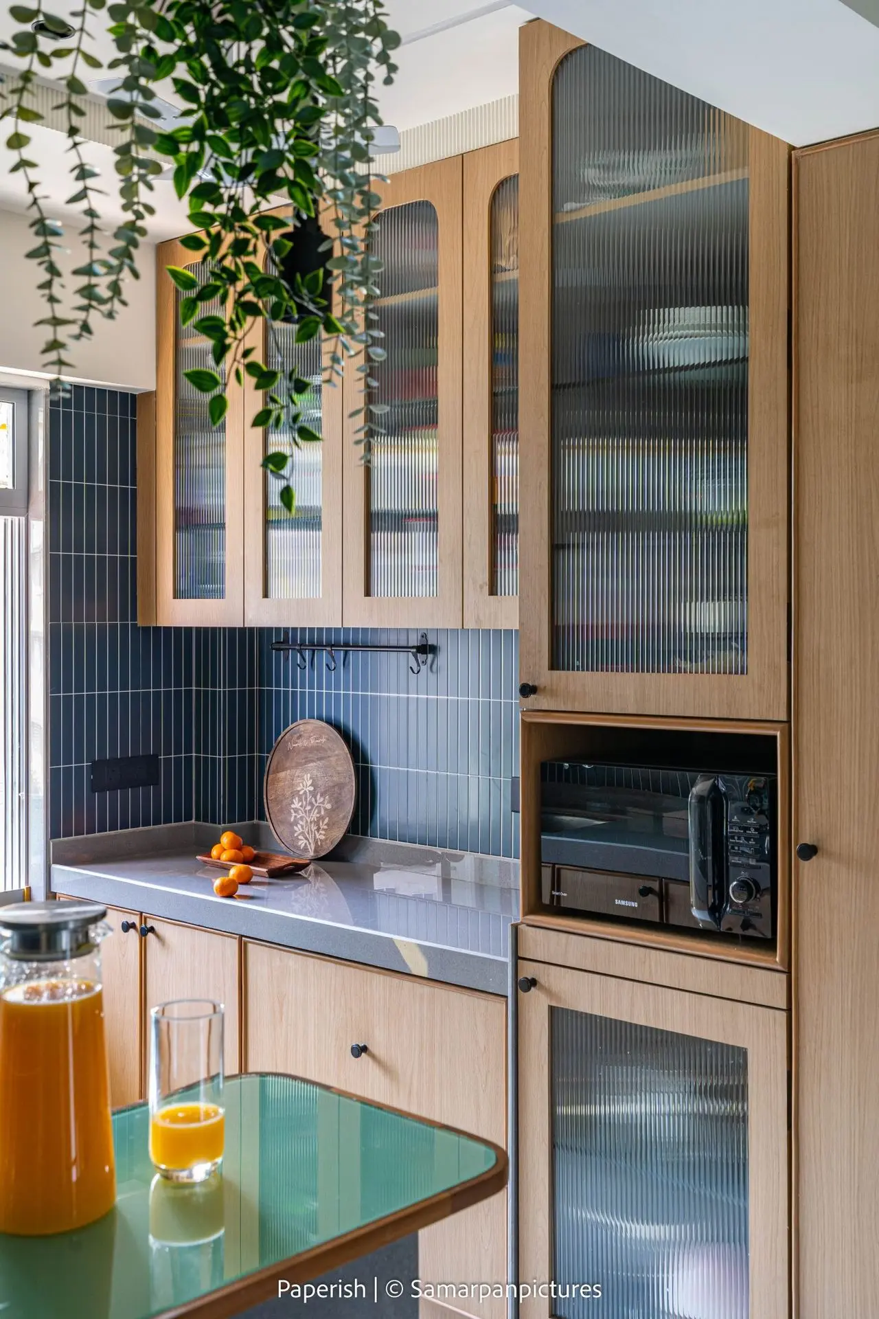 The kitchen, located along a narrow passage and directly adjoining the bedroom spaces, presented a spatial challenge. To overcome this, we cleverly blended the kitchen design along the sides of the wall, making it feel integrated rather than intrusive.