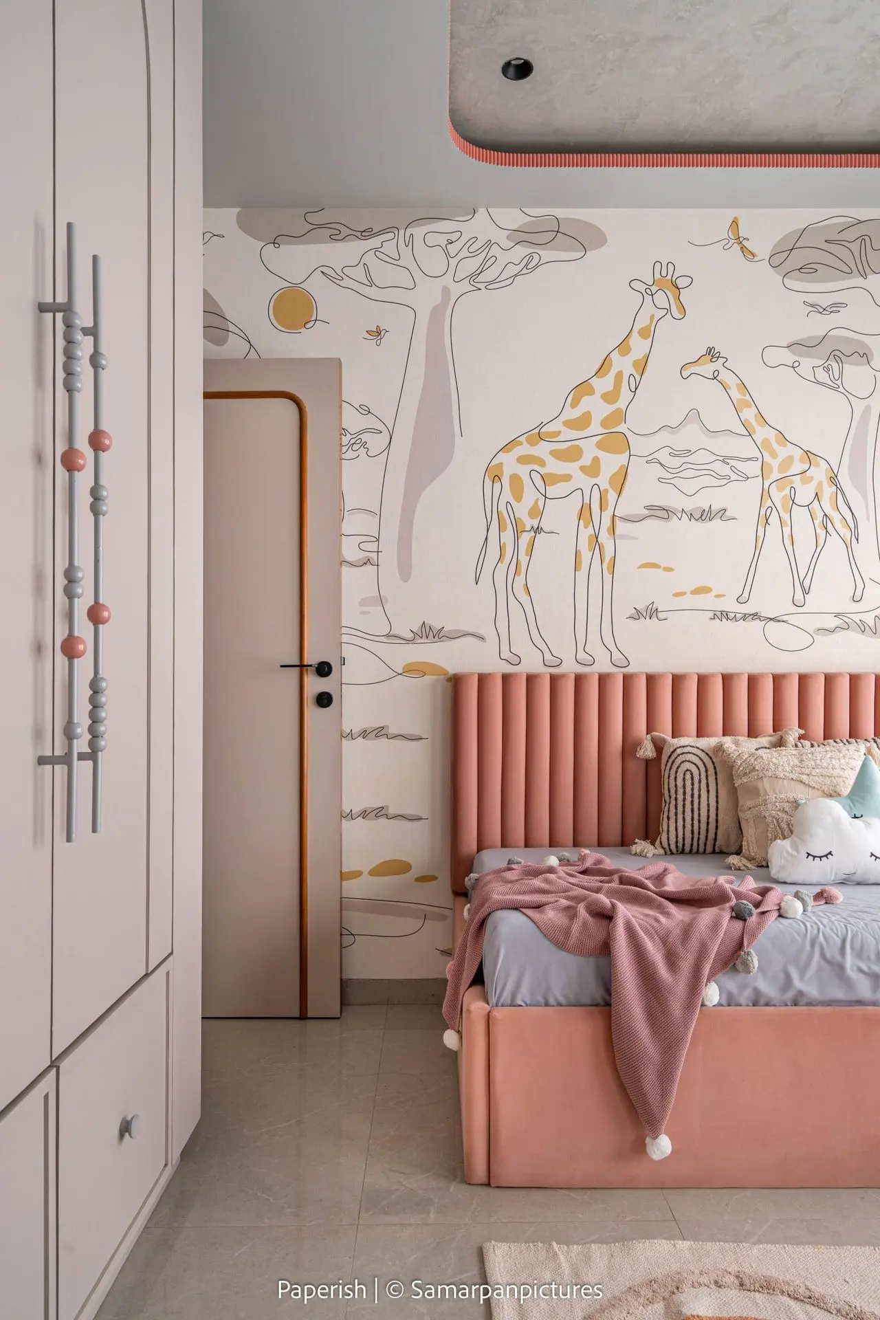 The daughter’s room is an Instagram-worthy expression of playful design. Filled with a vibrant palette of materials and colours, it’s a space that delights and entertains. A double-layered ceiling with a concrete texture speaks to the client’s love for tactile surfaces, while custom metal