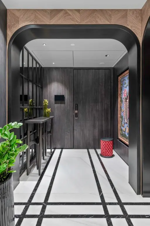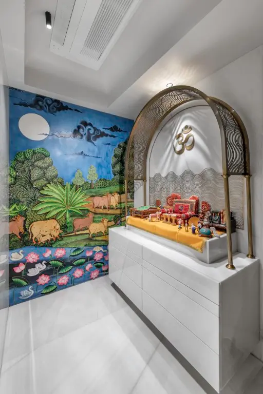 As you enter, there is a striking mirror panelling on the right side. On the opposite, is a beautiful artwork of Shrinathji, by Smitamoksh. The clients are big believers in Srinathji and wanted it to be an integral part of the space itself. The floor is a pure white marble with black marble inlay strips having a directional pattern leading one into the corridor. The archways define the circulation of the space, and dark ash and black inlay panelling defines the arches.