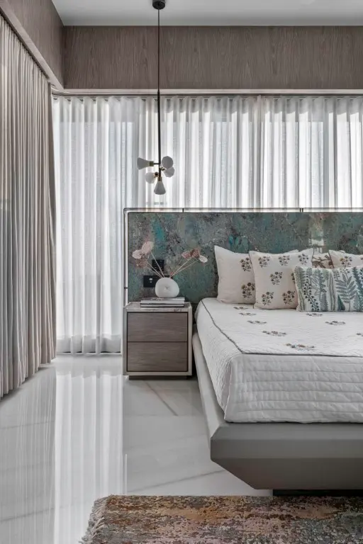 The master bedroom is essentially a pure white space. The highlight of this room is a beautiful green amazonite marble which forms the backdrop with hints of brass. This space is high on the idea of a green tropical theme for all the furnishings.