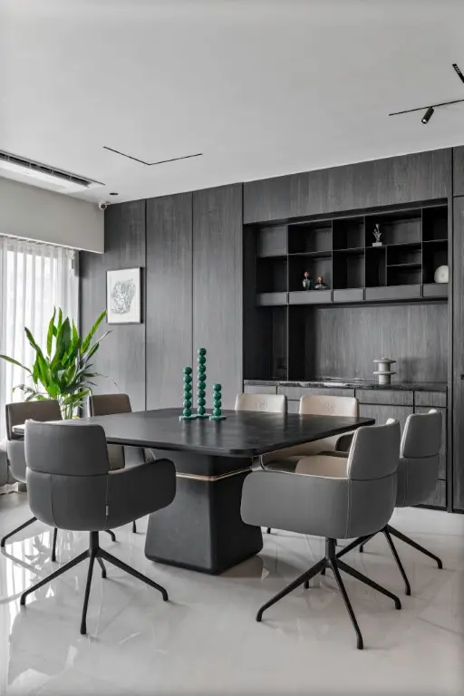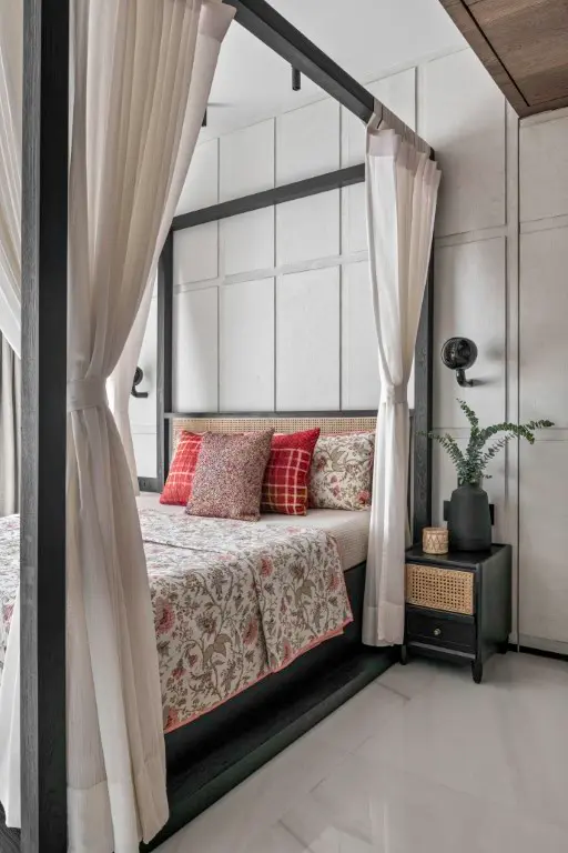 A beautiful black wood poster bed acts as highlight here along with a cane chair. This poster bed is in the shell with concrete wall on all sides. The ash black veneer becomes a continuous theme in the space, & in every area and aspect of the house. A splash of colour in the form of Indian textiles, cushion covers and furnishing add vibrancy. The dining space is flanked by a black metal unit, which is inserted into the black ash veneer wall to display curios and also acts as the dining console. Overall, the space is very