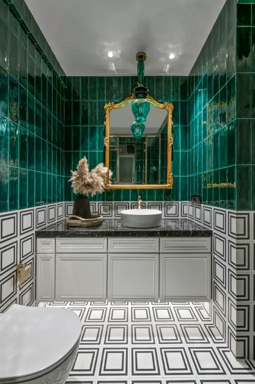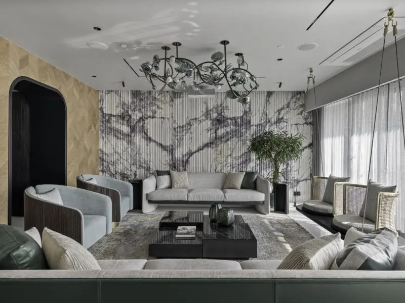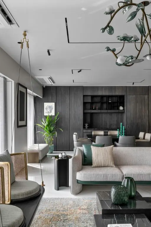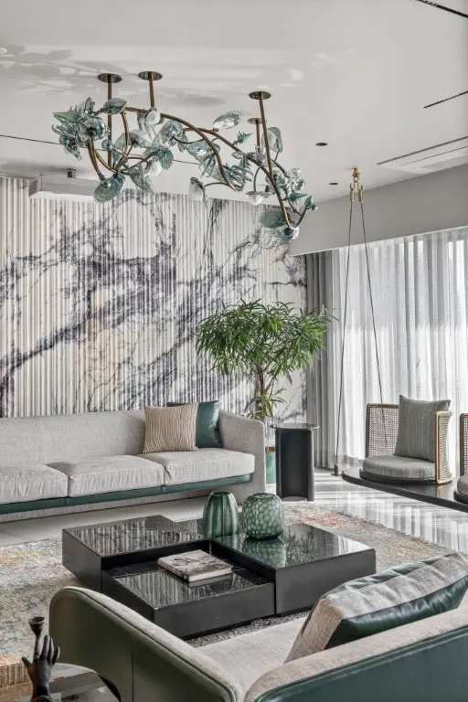 Light filters in throughout the house all times and there is the sense of green which gives a very calm and at the same time a luxurious feeling. The highlighting factor in the space is a beautiful white mist marble which has been fluted as the entire backdrop.
