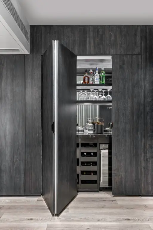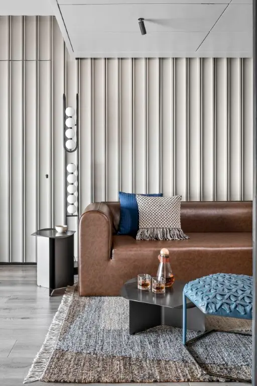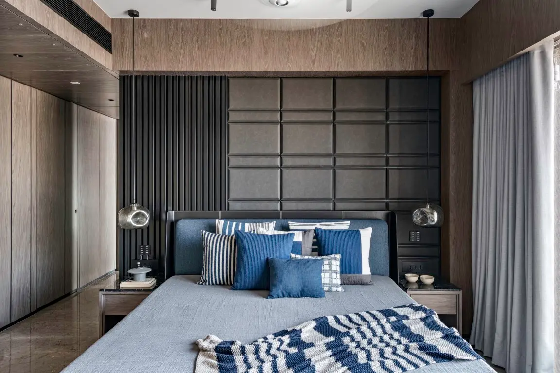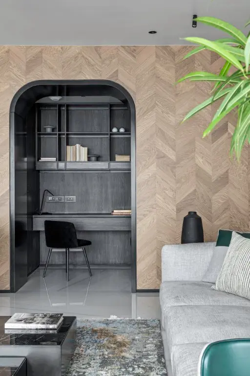 The play in the house is due to the wall texture that is mostly in white. An oak Chevron linear panelling on the wall is designed which leads you further into the living space. Each of these areas are defined by a very strong ash black wooden arch juxtaposed with the Chevron panels.