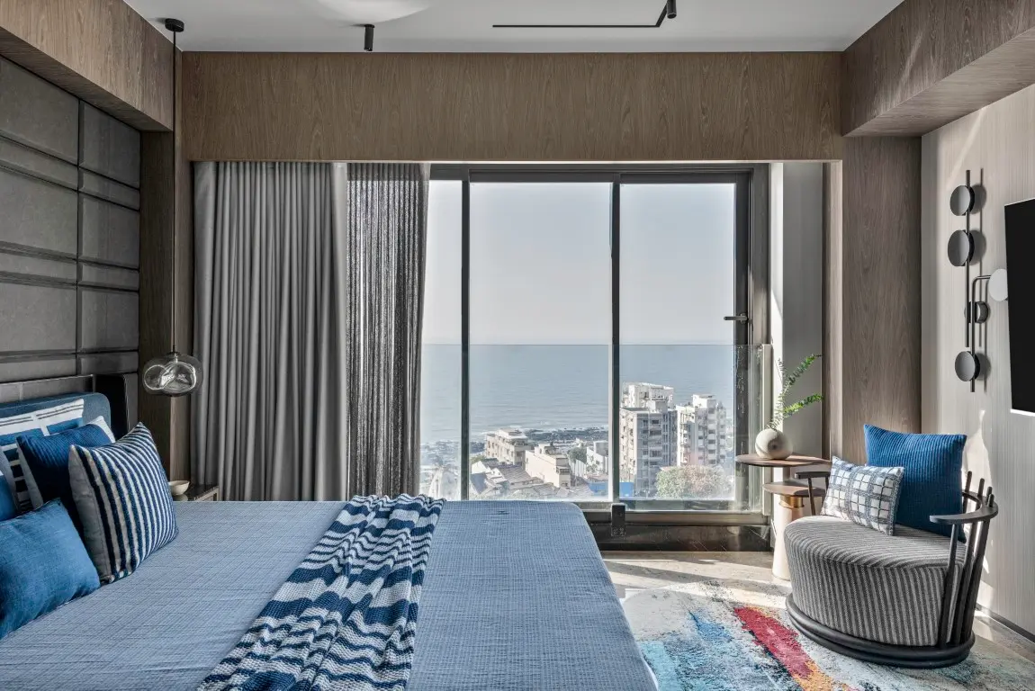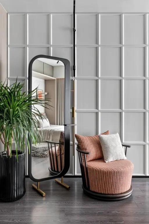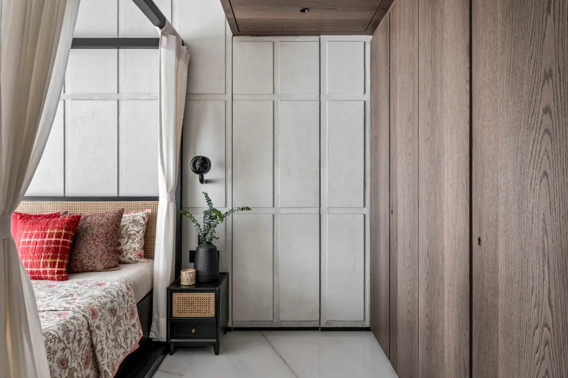 The daughter’s room, again, is a white space. Light grey wardrobes and an oak framed bed which is inserted within. The entire space is clad in white paneling and the furnishings have hints of rust. A beautiful teak mirror with brass elements adorns the space.