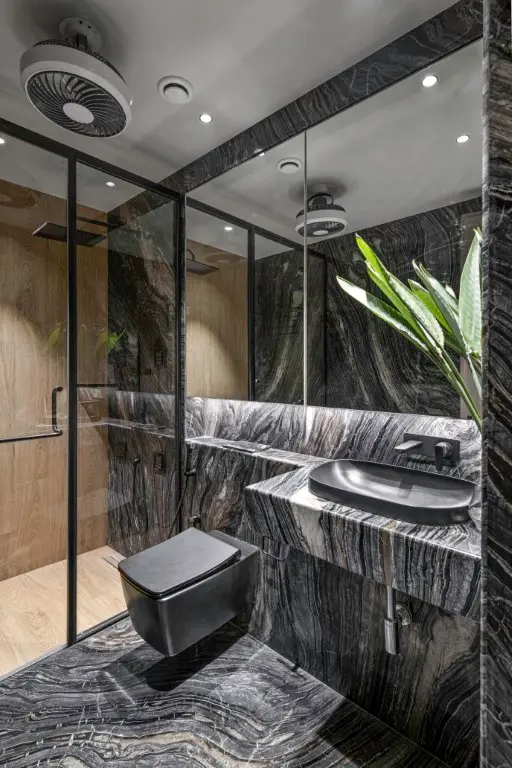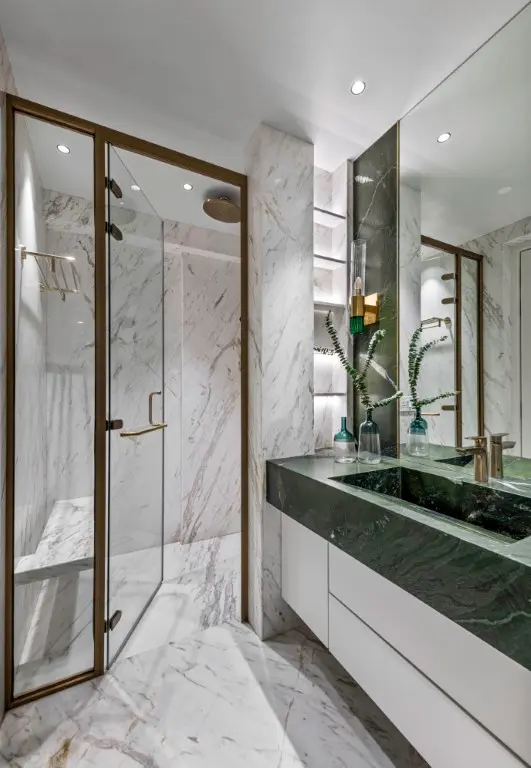 Overall a lot of marble is used and a neutral colour scheme with natural elements and a play of wall textures mostly in white.