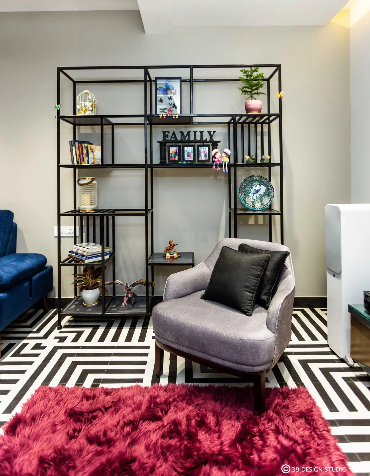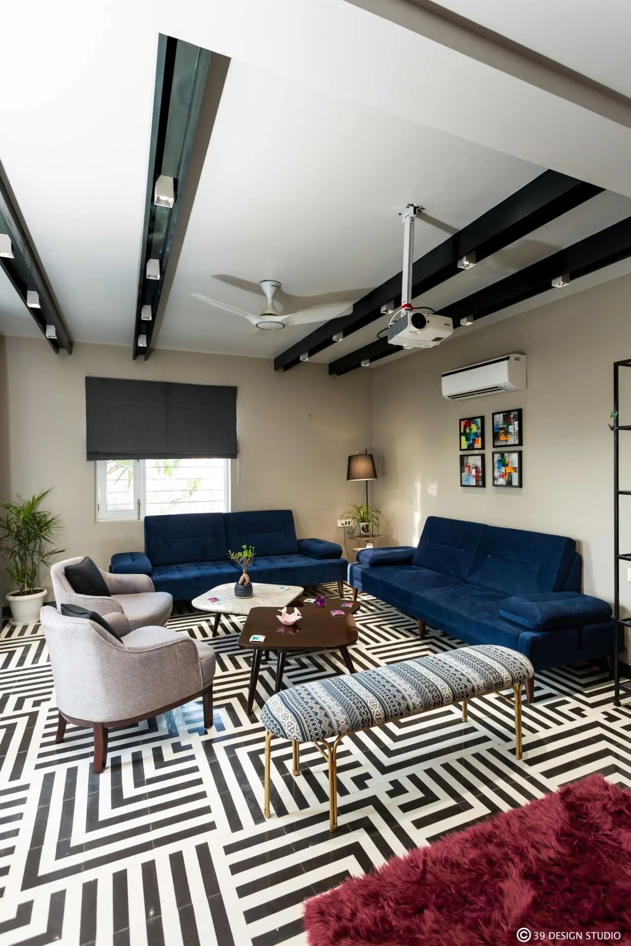 The lounge has a colour scheme of black and whites, a very busy tiled floor with playful furniture and grey walls to balance the aesthetics of the space.