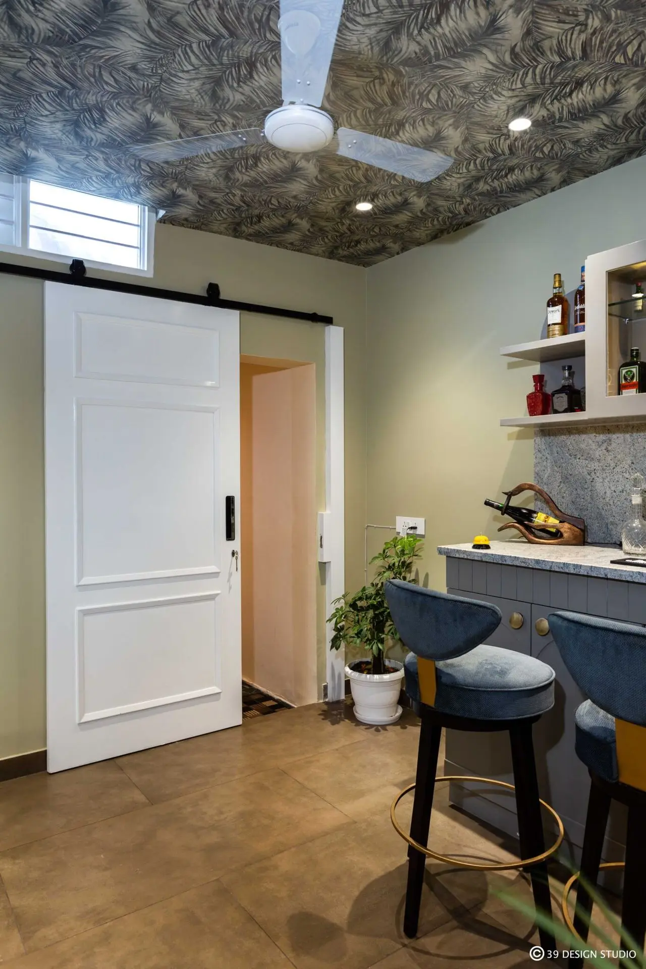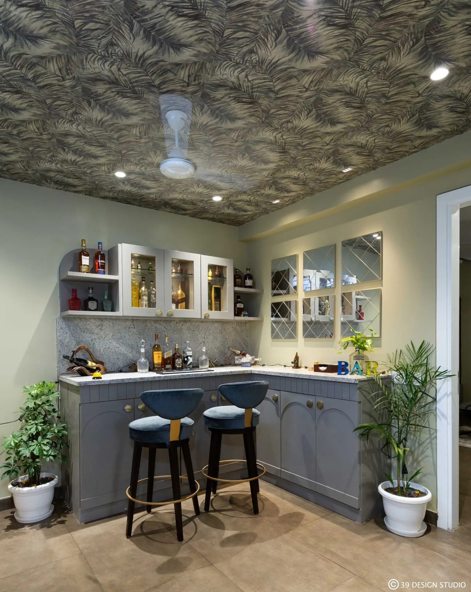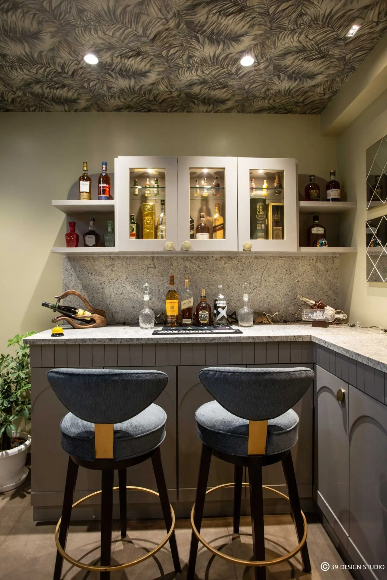 Inspired from the tropics, the bar is designed with the muted tones of greens and gold on to the accessories to enhance the space.